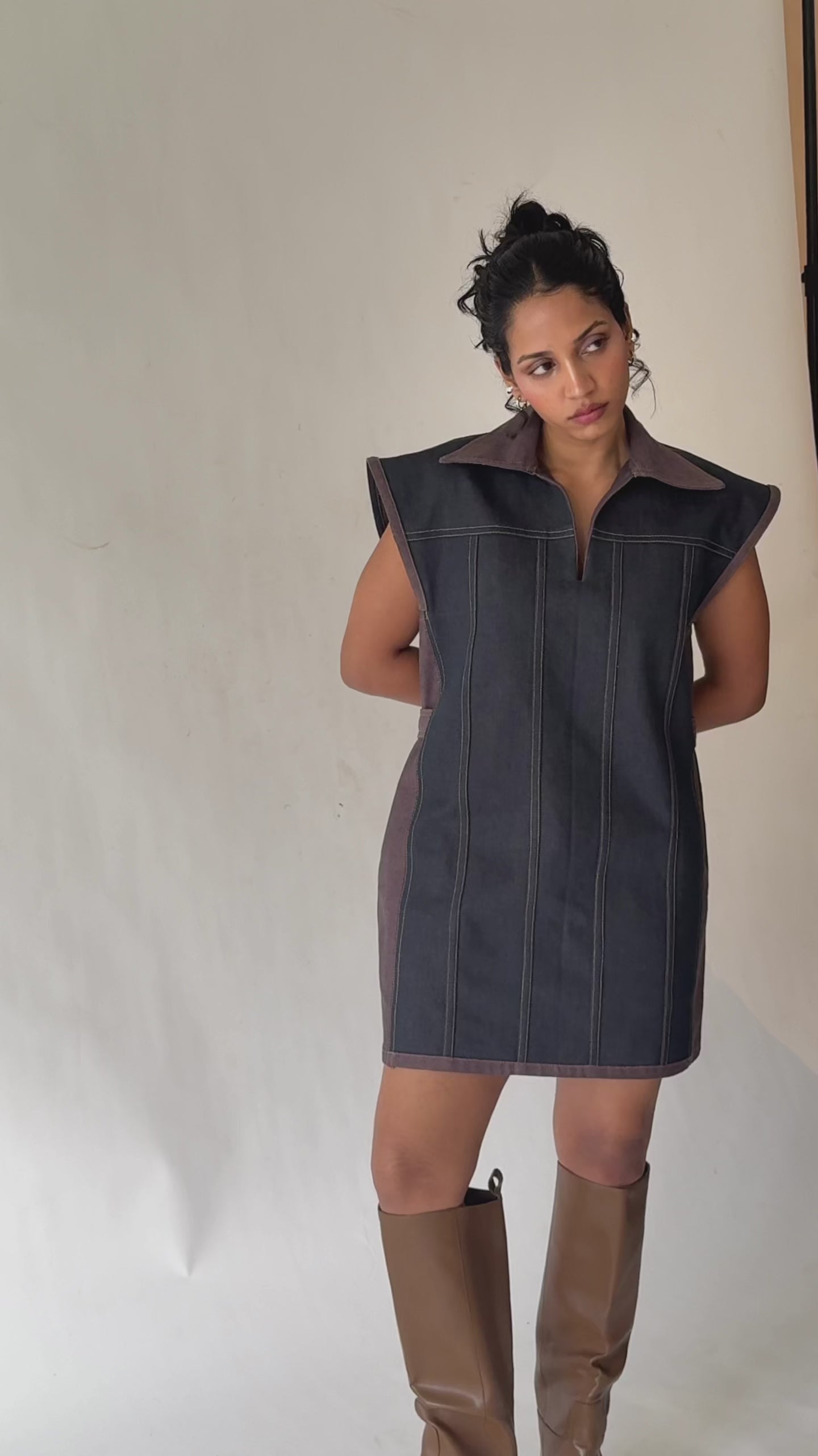 A structured dual-tone denim dress with contrast stitching and sculpted panels, designed to redefine modern utility dressing.